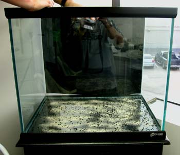 STEP 3: Adding bacteria and activated carbon to the bottom of the tank will help the break in period to be much shorter; the use of mulm and peat moss can also help the speed things up. Then add the substrate- in this case teralit is inboth layers and Volcanit is only in the top layer. About 4 inches of substrate in the front and about 8 inches in the back is the recommended amount.