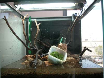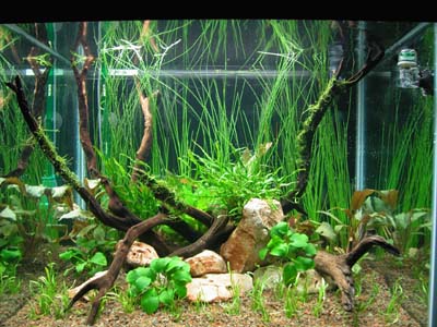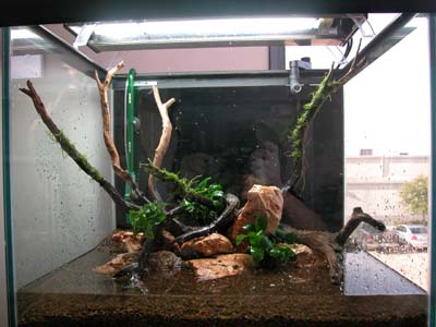 STEP 8: The tank is finished! The last details are connecting all the equipment and making sure that everything works. I like to skim the surface for any debris. After the 3rd day, 2 water changes a week are done for a month and after the second week for this size tank I like to add about 30 Cardina japonica and about 10 O-cats (otocinclus affinis) as well. The removal of dead foliage and the cleaning of the inside glass panes is part of a regular maintenance routine. If algae appears, don�t give up and remove as much as you possibly can by hand. Keep up the water changes and soon the algae will be gone. In about a month after setup the tank will be ready to host fish. Have fun aquascaping!